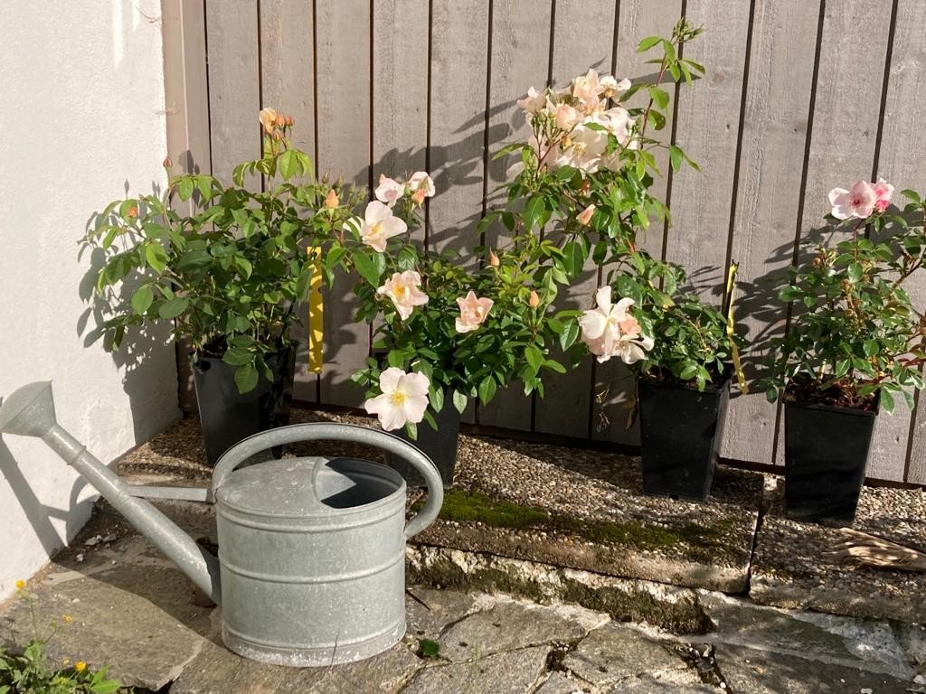 Unser Haus ist umgeben von einem Wiesengrundstück mit Büschen und Bäumen.